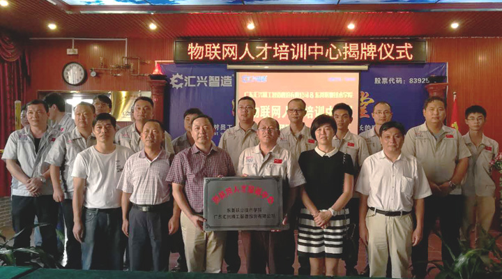 2017年9月27日下午, 東莞職業(yè)技術學院副院長楊云奇,計算機工程系主任胡選子博士,藝術設計系主任何鳳梅博士,計算機系曹文梁教授等專家人員一行蒞臨廣東匯興精工智造股份有限公司(股票代碼:839258)考察調(diào)研并舉行“物聯(lián)網(wǎng)人才培訓中心“基地揭牌儀式。匯興智造董事長鐘輝,匯興中德智能制造研究院院長李康順教授熱情接待了調(diào)研組一行。